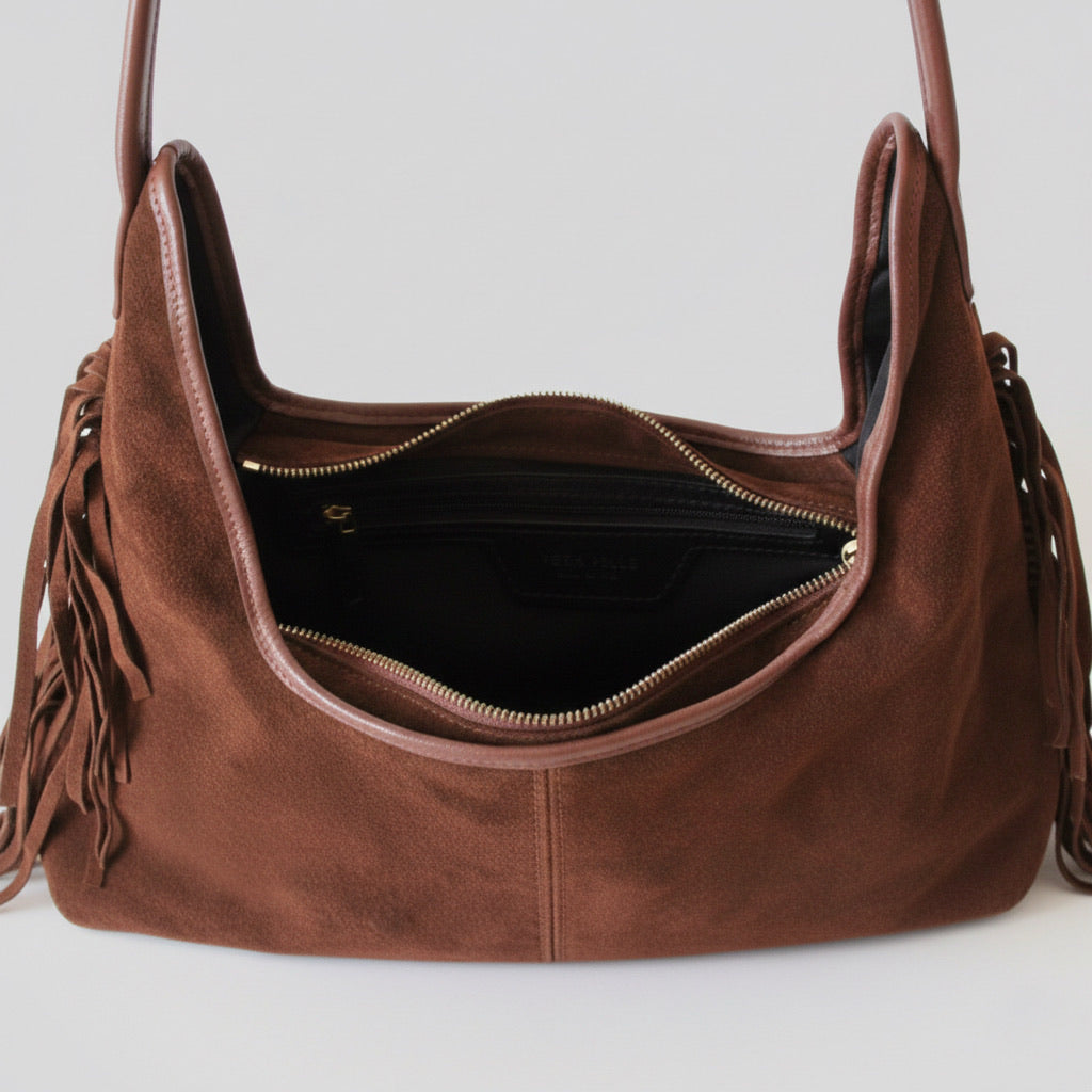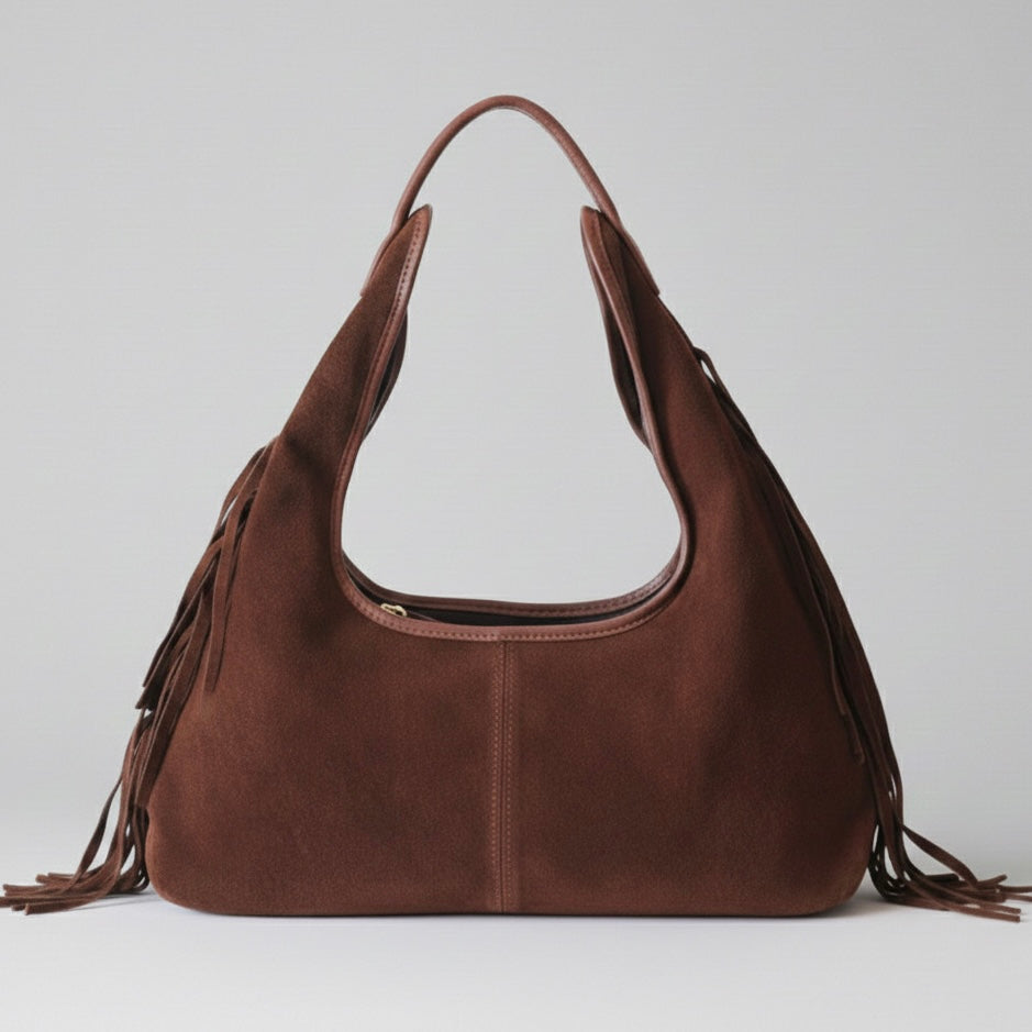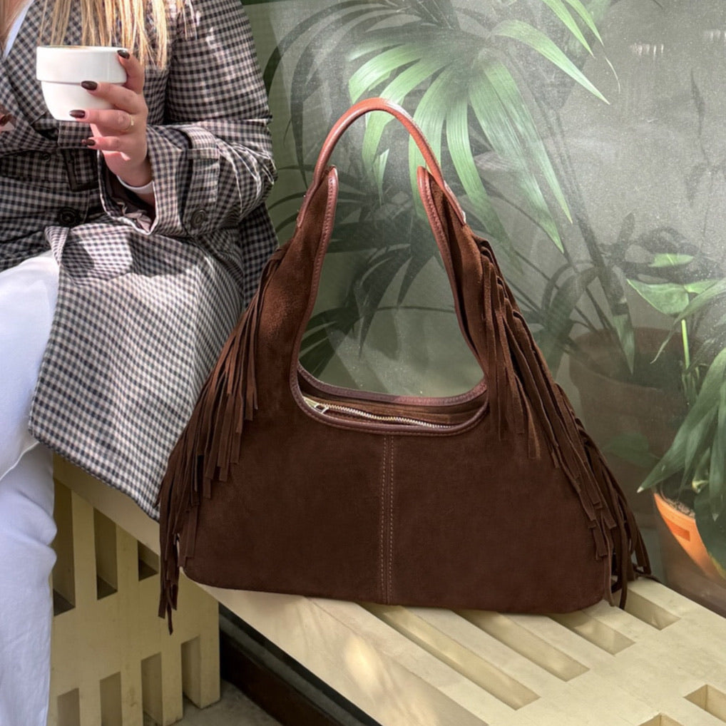 - Bolso de hombro confeccionado en piel de serraje 100% en color camel y con detalles de flecos