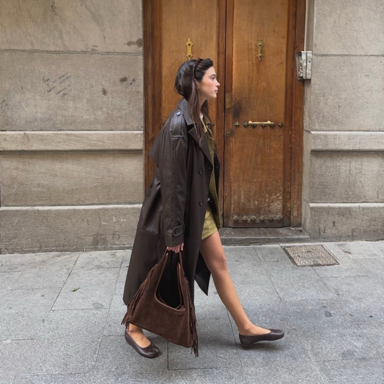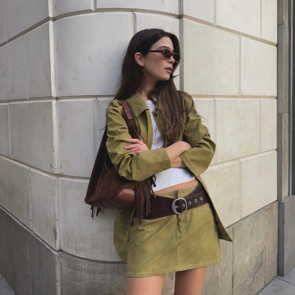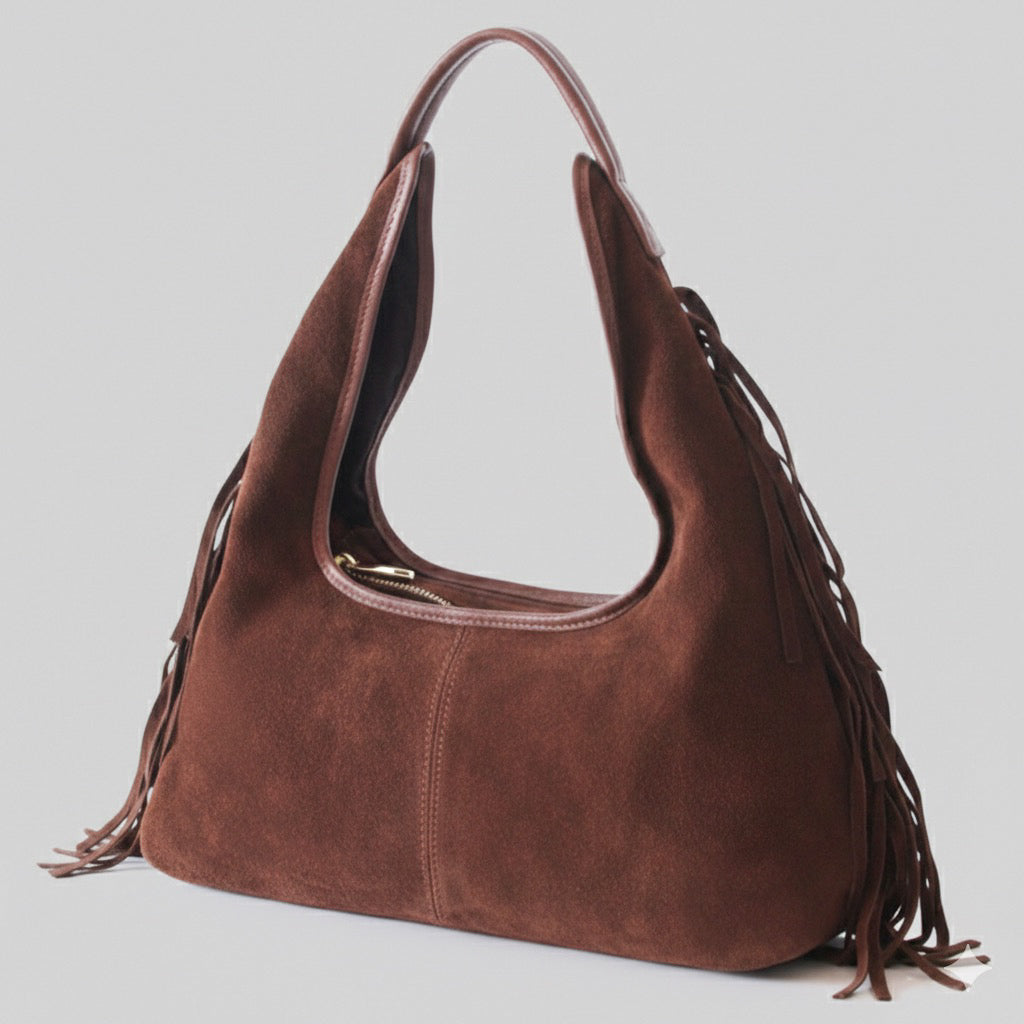 - Bolso de hombro confeccionado en piel de serraje 100% en color camel y con detalles de flecos