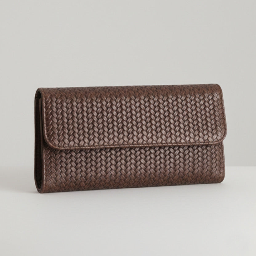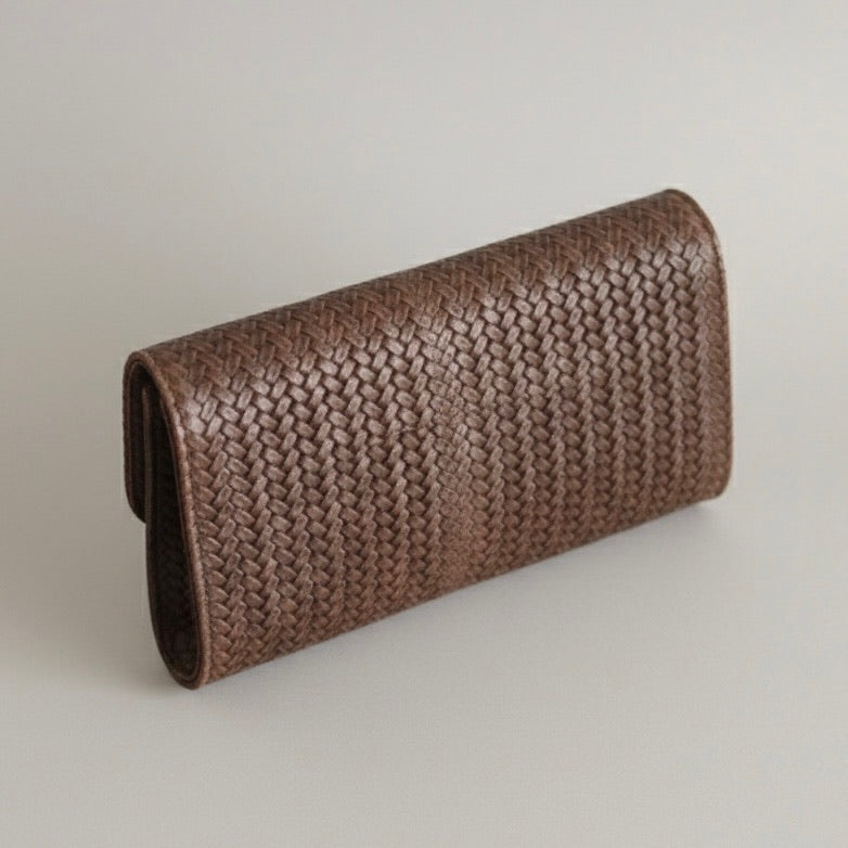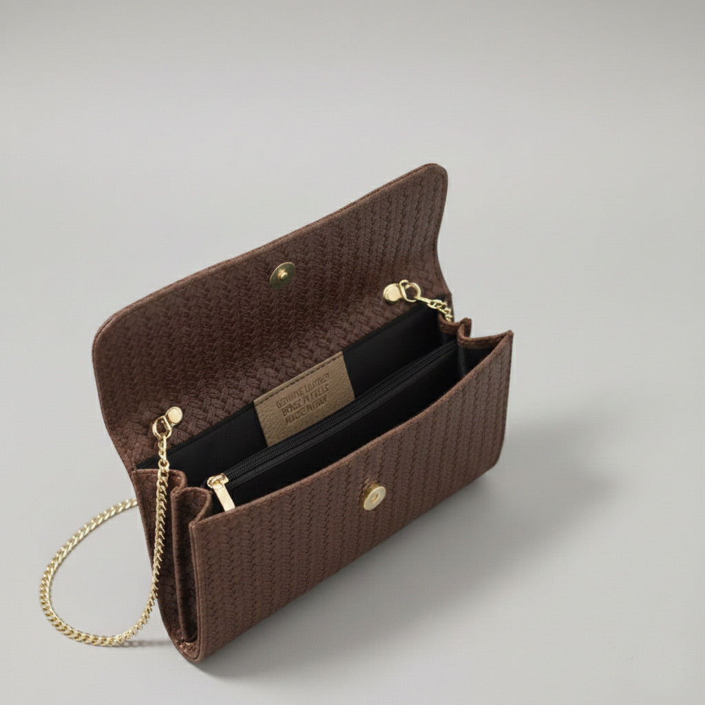 - Clutch bandolera confeccionado en piel de vacuno 100% en color marrón chocolate y con estampado efecto trenzado